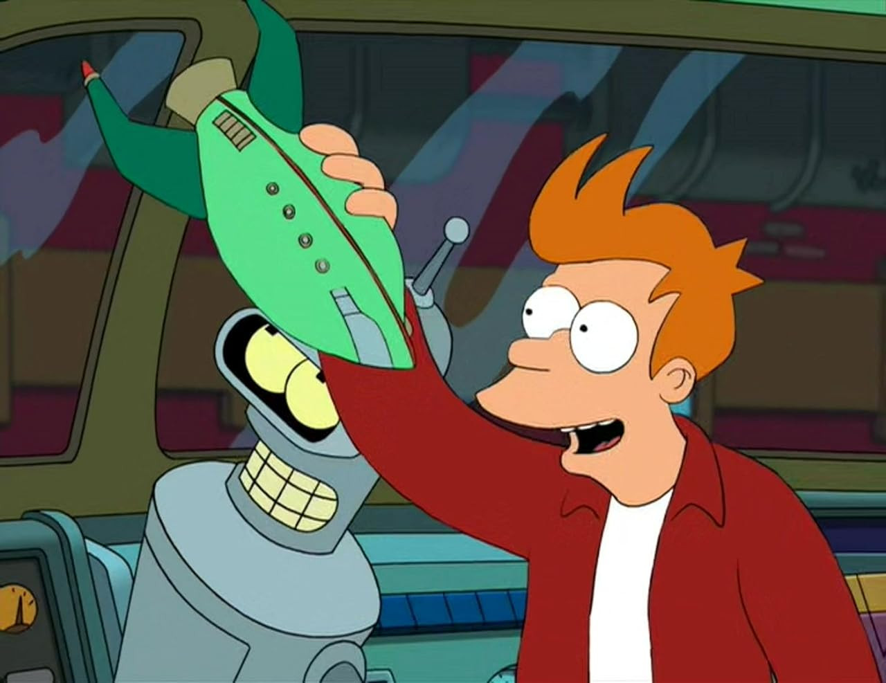 3 сезон 3 серия сериала «Футурама» начинается с нелепой ситуации. Бендер уговаривает Фрая угнать корабль и прокатиться по планете. Друзья не догадываются, что Лила привязала судно к зданию и, если взлететь, вся постройка отправится за судном. После возвращения в Нью-Йорк друзья с ужасом узнают, что разрушили офис. Недовольный профессор избавляется от Лилы, Фрая и Бендера. Теперь трио вынуждено искать новую работу. Туранга предлагает использовать свой специальный прибор, чтобы получить новые должности и устроиться на работу. Ошибочно она вставляет свой чип Фраю. В итоге Лила получает должность доставщика пиццы, а Фрай получает престижную должность. Бендеру же доверено знакомить людей, которые длительное время были в анабиозе, с новым миром.
