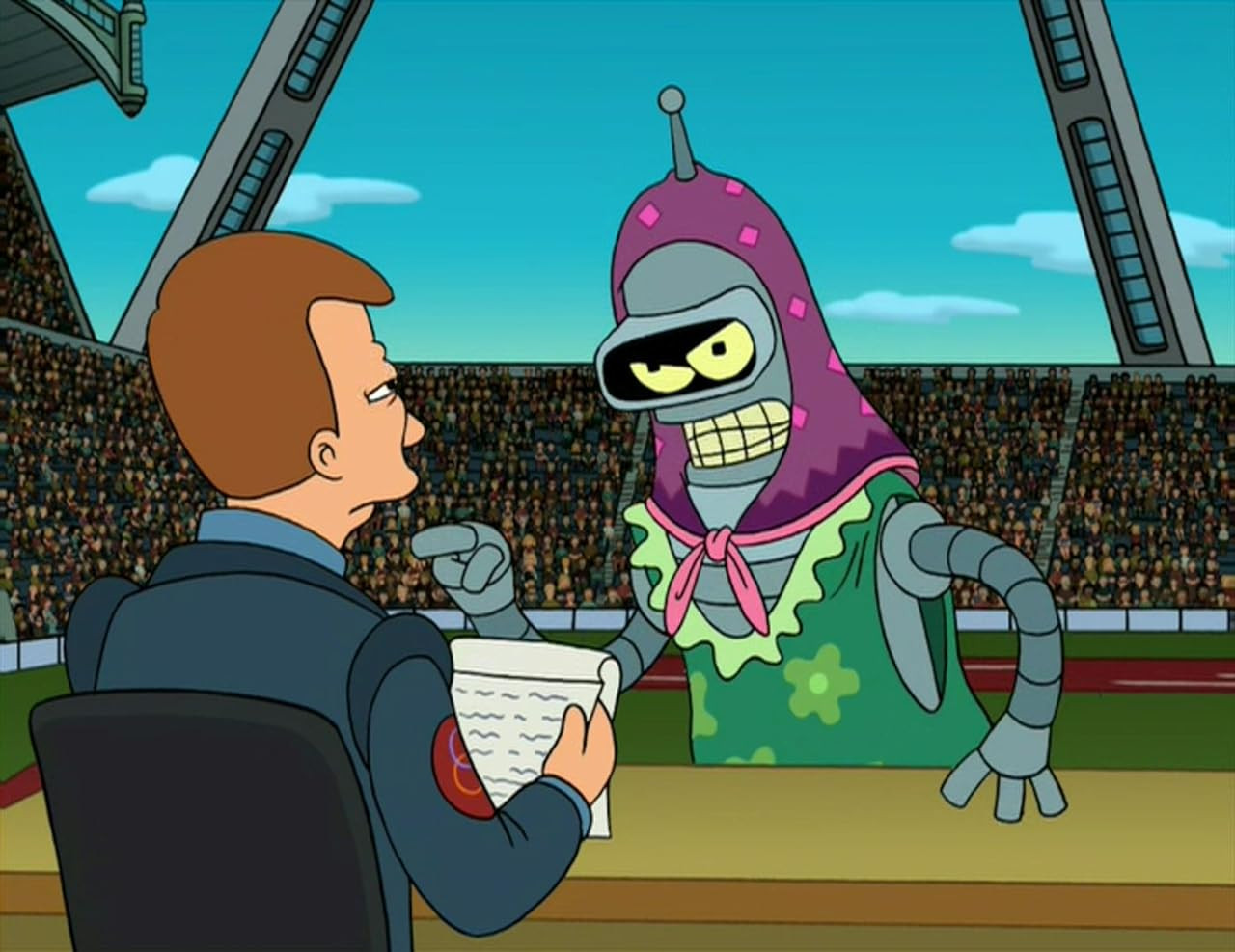 5 сезон 13 серия сериала «Футурама» начинается с интересного события. На планете проходят Олимпийские игры 3004 года. Гермес убеждает профессора помочь ему уменьшиться в размерах, чтобы тот имел возможность принимать участие в соревнованиях. Бендер тоже заинтересовывается спортом, но понимает, что среди его весовой категории победить вряд ли получится. Тогда он решает пойти на хитрость. Бендер переодевается в девушку-робота Колетт и успешно справляется со всеми заданиями. По итогу состязаний в его руках оказывается более пяти золотых медалей.